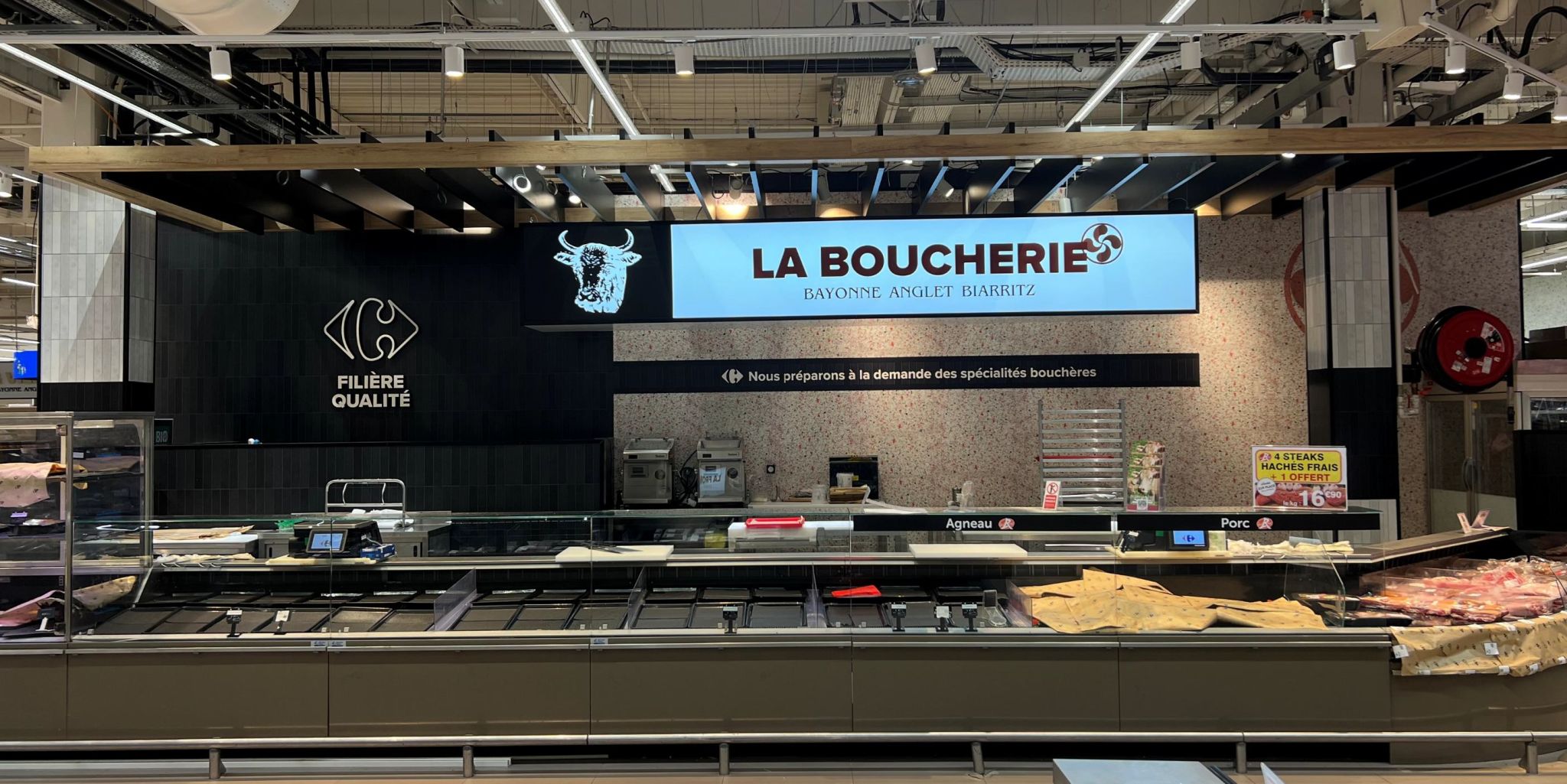 @2025 - Zone Boucherie - Carrefour - Anglet Avec 43 ans d’expérience, nous sommes à même de répondre à l’évolution perpétuelle des besoins de la grande distribution. Les magasins ne se contentent plus d’une signalétique fonctionnelle : chaque espace devient aujourd’hui un univers unique et immersif, où l’identité de l’enseigne prend vie.
